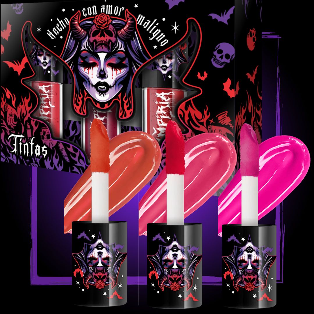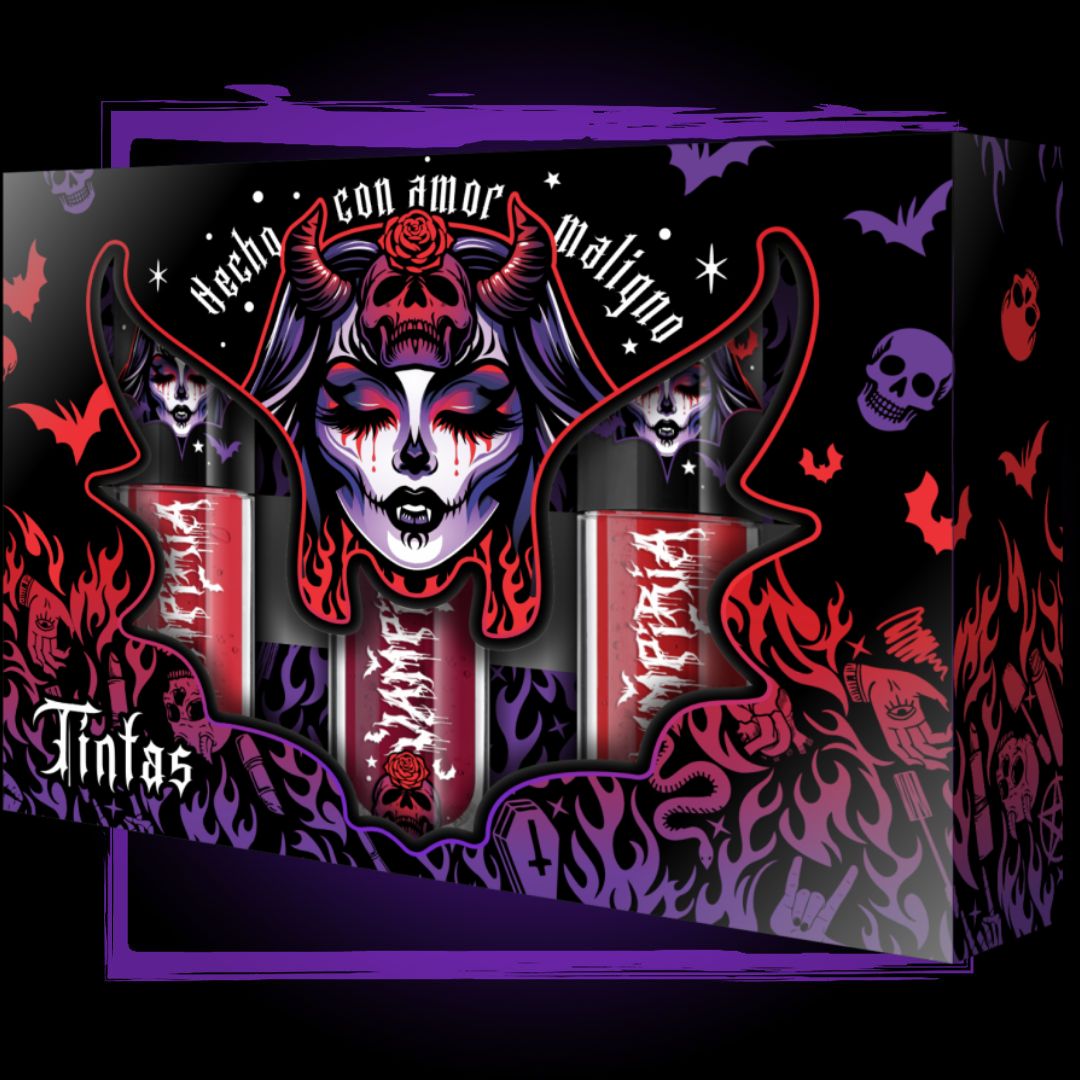 Inspiradas en la estética gótica y el encanto de los vampiros, estas tintas son el complemento perfecto para cualquier amante del estilo oscuro y sofisticado. Atrévete a ser diferente y deja que tus labios hablen por ti con el Kit de Tintas de Labios "Vampiria Bloody". ¡Haz que cada beso cuente!