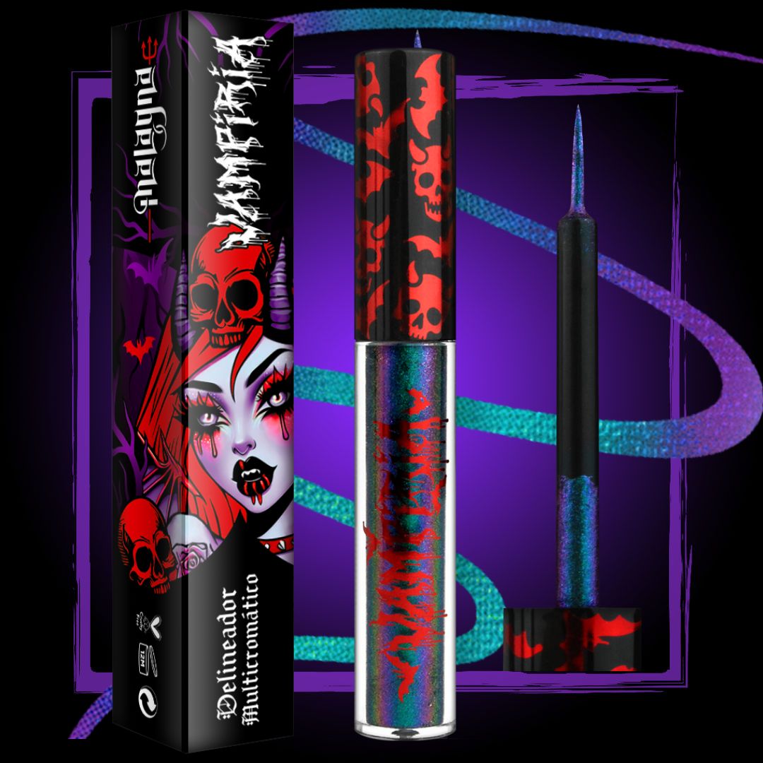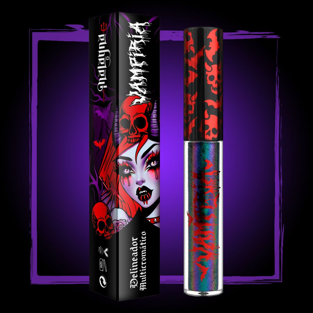 - Diseño Único: El empaque tiene un diseño impreso de una Vampiresa con cuernos, y calavera en la cabeza con detalles de murciélagos, no solo es llamativo, sino que también refleja tu estilo rebelde, rockero y gótico.