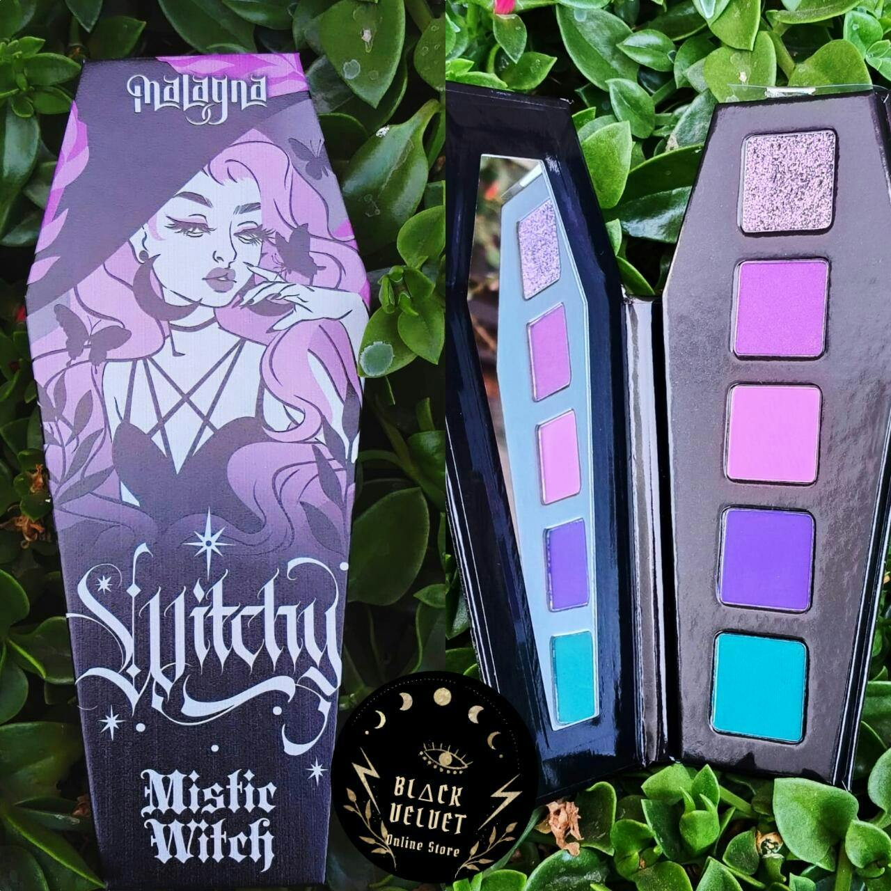 Paleta de sombras de ojos de 5 colores morados, sombras moradas, en forma de ataúd, con diseño de bruja, ultra pigmentadas, de formula vegana y libres de crueldad, para maquillaje de ojos ahumados.